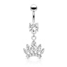 Word een prinses voor een dag met de hulp van deze mooie navelpiercing met een kroontje van steentjes als hanger. Deze ultra vrouwelijke prinsessenkroon bestaat bijna uitsluitend uit stenen. Voor de puntjes zijn ovale steentjes gebruikt, die net als bij een echte kroon verschillende lengtes hebben. De basis van de kroon bestaat uit kleine ronde stenen die het geheel prachtig afmaken.