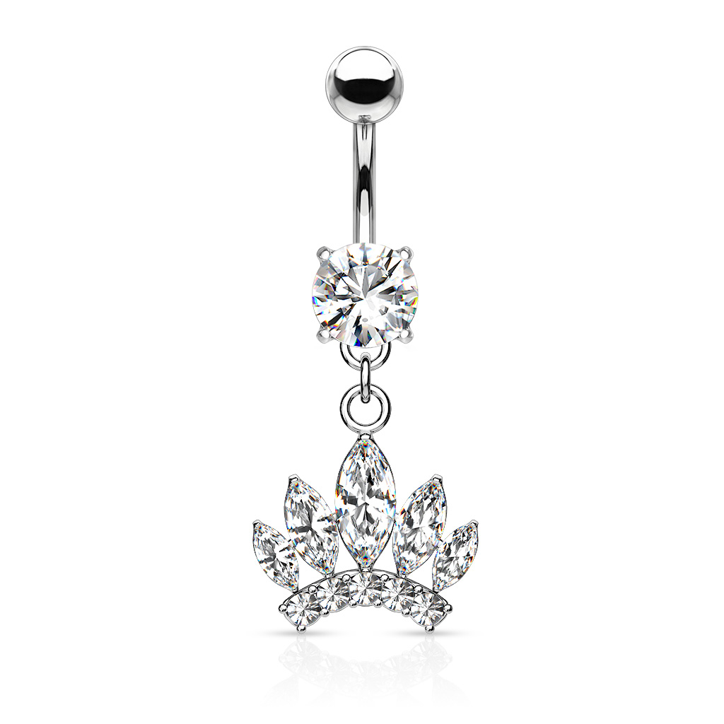 Word een prinses voor een dag met de hulp van deze mooie navelpiercing met een kroontje van steentjes als hanger. Deze ultra vrouwelijke prinsessenkroon bestaat bijna uitsluitend uit stenen. Voor de puntjes zijn ovale steentjes gebruikt, die net als bij een echte kroon verschillende lengtes hebben. De basis van de kroon bestaat uit kleine ronde stenen die het geheel prachtig afmaken.