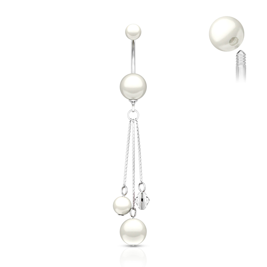 Dit is een lieve navelring gemaakt van chirurgisch staal met acryl parelmoeren balletjes. Het is een leuke en klassieke navel ring met verschillende hangertjes. Vanaf de onderste bal hangen drie kettingen van verschillende lengtes in een asymmetrisch ontwerp. Een van de balletjes in de vorm van een diamant. Alle balletjes zijn dezelfde kleur.