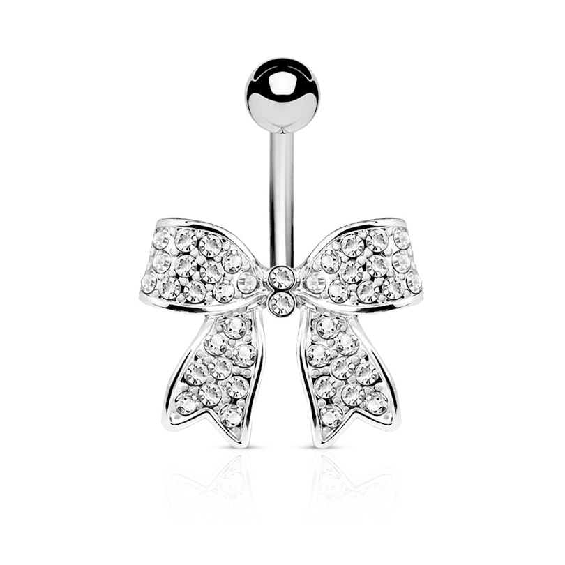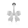 Deze charmante navel piercing is in de vorm van een strikje. Het staafje en balletje zijn gemaakt van chirurgisch staal, en het strikje van messing. Het strikje is gezet met kleine CZ steentjes, met twee grotere stenen in het midden. Het sieraad heeft een externe schroefdraad, wat betekent dat je simpelweg het balletje op het staafje moet draaien om hem vast te zetten in je piercing. Dit charmante sieraad is een leuke toevoeging aan je collectie piercing sieraden.