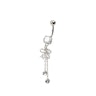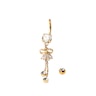 Deze navelpiercing is een iets langere. Het meet iets minder dan 6 cm. De lengte van de staaf is 10 mm van de totale lengte. De rest bestaat uit bling en decoratie in de vorm van stenen, kettingen en een boog. De lus bestaat uit messing en twee druppelvormige stenen, die net onderaan de steen onderaan de staaf zitten. Onder de lus zitten twee kettingen, waar aan elke ketting een duidelijke steen zit. De ene ketting is langer dan de andere. Bij het dragen van dit sieraad is het belangrijk om op de kettingen te letten. Ze kunnen gemakkelijk vast komen te zitten in je kleding. En als je een snelle beweging maakt, kan de hanger eraf vallen - In plaats van dat je sieraad uit je navel scheurt.