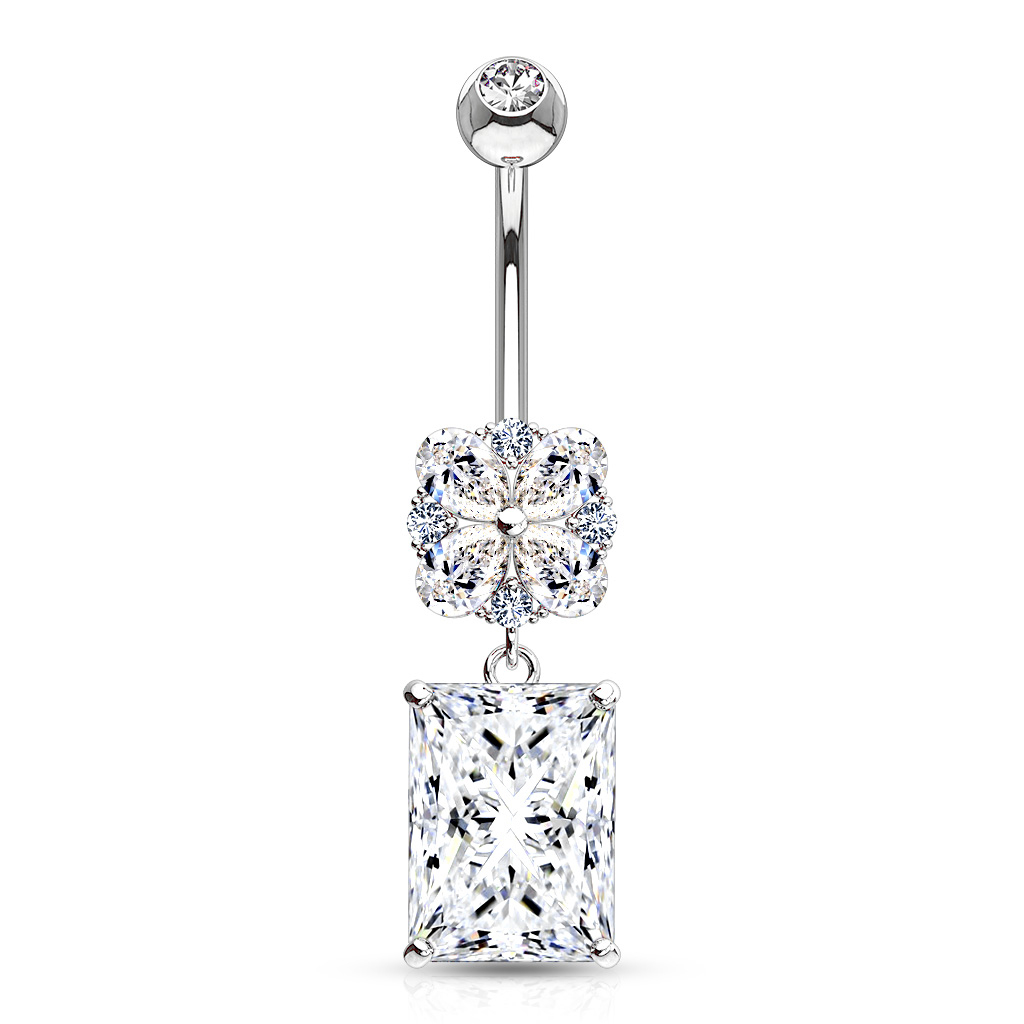 Navelpiercing uit 14 karaats goud met een bloem en een vierhoekige steen