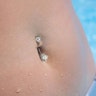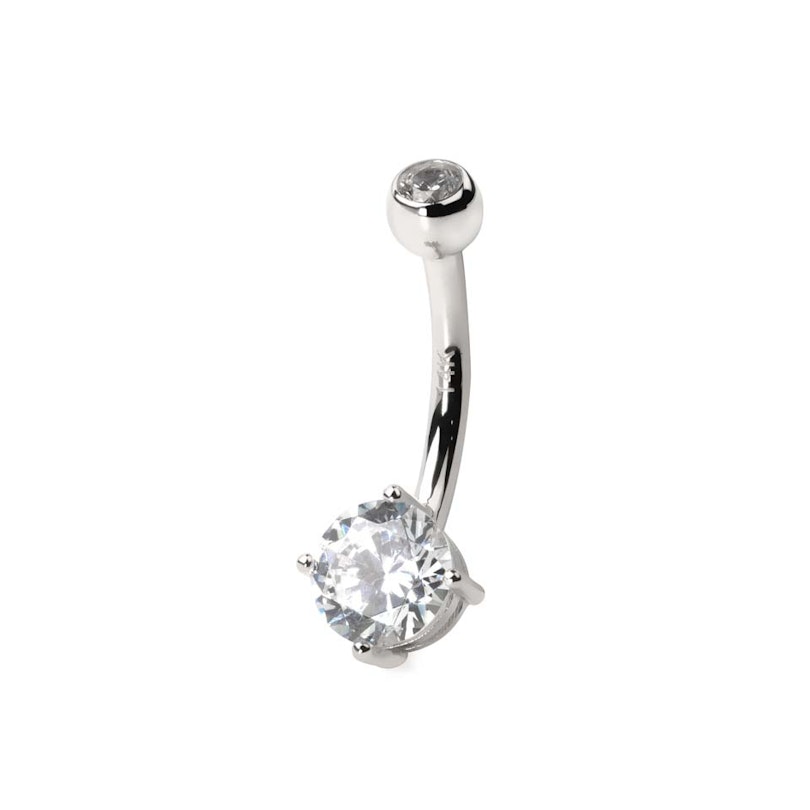 Het sieraad bestaat uit ƩƩn stuk; het enige wat je er van af kunt schroeven is het topballetje. Het onder balletje is vast gemonteerd aan de staaf. Daardoor is er geen beweging in het onderste deel van de navelpiercing. Het steentje in het onder balletje wordt vastgehouden door vier kleine armen, die er voor zorgen dat het steentje niet kan verschuiven.