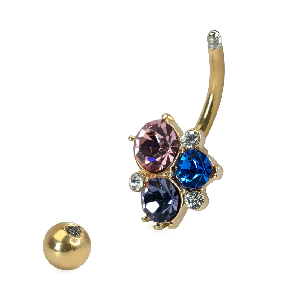 Deze navelring van chirurgisch staal heeft een 5 mm balletje aan de bovenkant en een cluster steentjes in complementaire kleuren aan de onderkant. De steentjes zijn met tanden gezet.