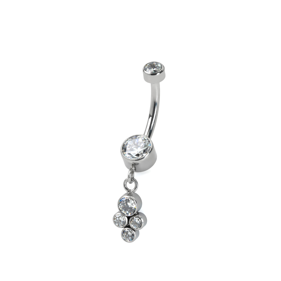 Dit navelstaafje rockt een cluster van vier steentjes die aan de grote glinsterende steen bungelen. Het prachtige sieraad is gemaakt van titanium, perfect dus voor nieuwe piercings gezien de hypoallergene kwaliteiten.