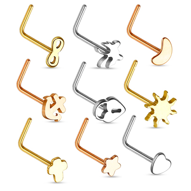Deze neuspiercing heeft verschillende soorten motieven. Kies uit o.a. het oneindigheidsteken, een anker of een kruis. De keuze is aan jou, evenals de kleurkeuze. Alle motieven zijn verkrijgbaar in drie kleuren: glanzend, goud en roodgoud.