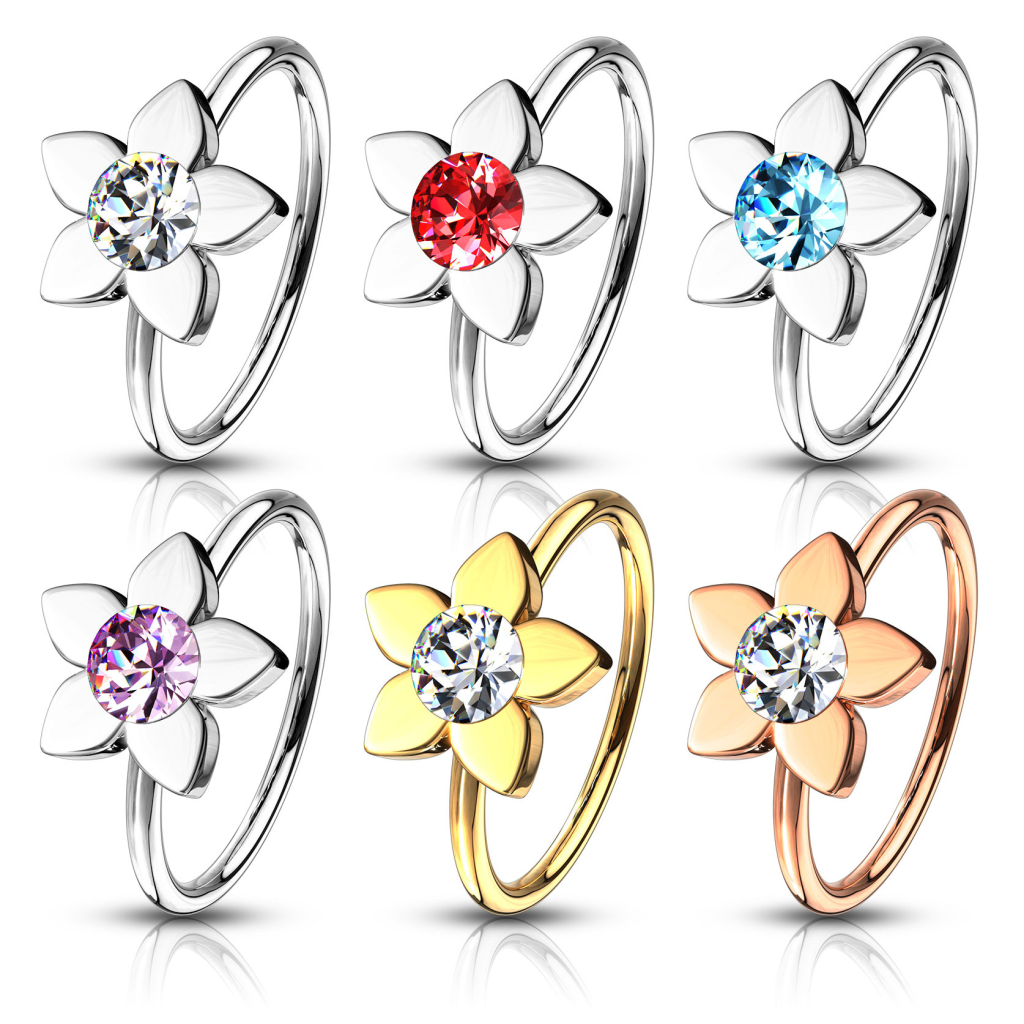 Het sieraad waar je nu naar kijkt is een neusring met een lotusbloem op de voorkant van het sieraad. In de lotusbloem zit een ronde steen waarvan je zelf de kleur kunt kiezen. Je kunt dit sieraad bijvoorbeeld met een roze steen of een rode steen kopen. Daarnaast kun je ook zelf de kleur van het sieraad zelf kiezen - kies onder andere tussen een goudkleurige of blank glanzende variant van het sieraad. Zo kun je dus helemaal zelf jouw perfecte sieraad samenstellen. Wij willen er echter wel op wijzen dat de gouden en roodgouden variant van het sieraad alleen verkrijgbaar zijn met een transparant steentje.