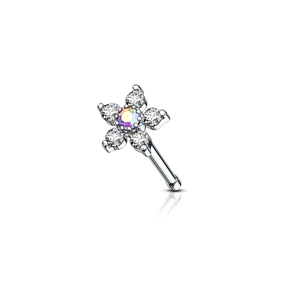 Op de voorkant van het staafje zit het bloemetje, waar het natuurlijk echt om draait. De bloem is onegeevr 6,5 mm in diameter. De blaadjes zijn gevormd uit kleine, transparante steentjes. Ongeacht welke kleur van het staafje en welke kIeur steentjes je kiest voor het steentje in het midden, de blaadjes zijn steeds transparant. Het is dus slechts de kleur van het staafje en de kleur van het steentje in het midden die je kunt kiezen. Kies je voor het glanzende model, dan is er iets meer te kiezen qua kleurencombinaties dan bij de gouden of roodgouden variant.