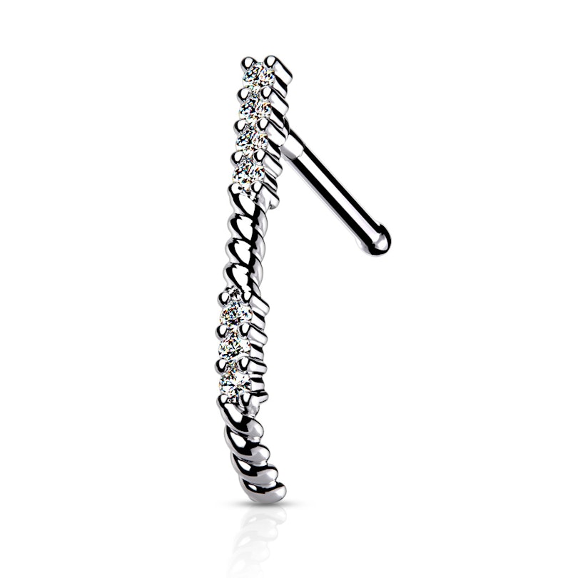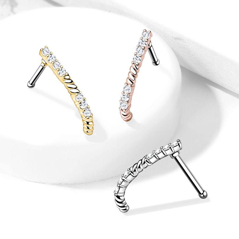 Ben je op zoek naar uniek Ʃn chique? Dit sieraad heeft het allemaal, met steentjes die de weg vrijmaken om een statement te maken. De totale lengte van deze unieke neuskruiper is 13 mm. Het sieraad is beschikbaar in drie verschillende kleuren: zilver, goud en rosƩ goud. Het staafje heeft een standaard draaddikte van 0.8 mm en een lengte van 6 mm. Een buitengewoon sieraad dat een must-have is voor je collectie.