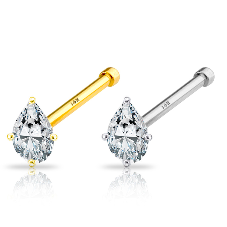 Schattig klein neusstaafje uit 14 karaats goud. aan het uiteinde van de 6 mm lange staaf zit een kleine druppelvormige steen. Deze wordt door een solide houder op zijn plek gehouden. Aan het andere uiteinde van de staaf - dus het deel dat in de neus zit - is een klein balletje gemonteerd dat als stop dient. De druppel is niet veel groter dan de staaf, zodat deze door het piercingsgat past, zonder dat de piercing er uit kan vallen.