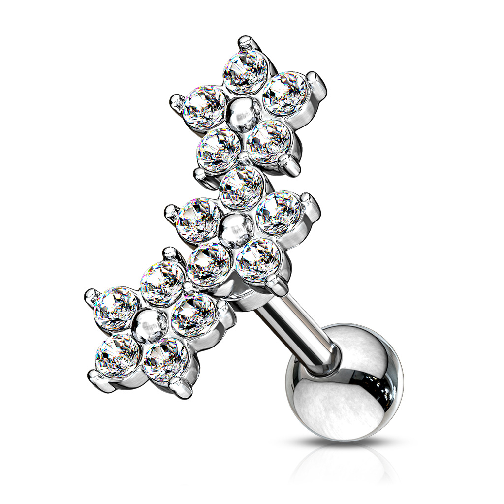 Dit piercing sieraad is ideaal om te dragen in een helix, zoals je ook kunt zien bij het model op de productafbeelding hierboven. De drie bloemen op de voorzijde van de staaf buigen namelijk een beetje, zodat ze de rand van je oor kunnen volgen. De voorkant meet ca 12 mm van bloem tot bloem en bestaat uit drie kleine vijfbladerige bloemetjes. De bloemen zijn verkrijgbaar in drie verschillende kleuren - en het is enkel de kleur die het verschil maakt tussen de drie modellen. Voor de rest is alles hetzelfde.
