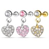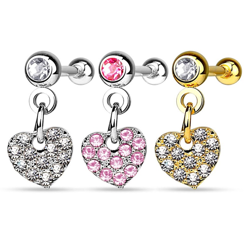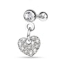 Deze stud heeft een balletje met een steentje, waar een mooi hangertje aan bungelt. Het hartje is bezaaid met prachtige steentjes die geslepen zijn als diamanten zodat het licht reflecteert vanuit alle hoeken.