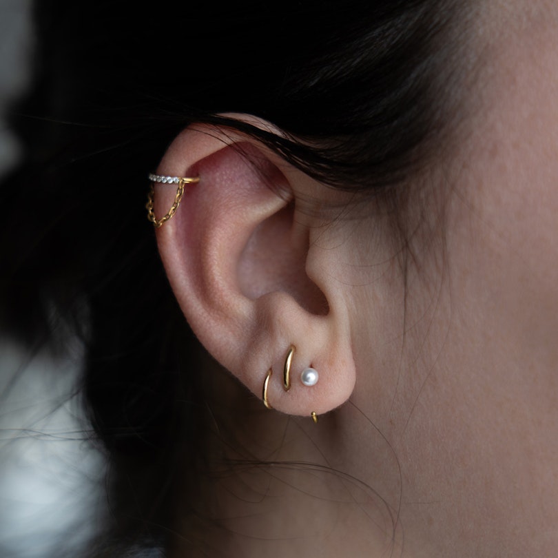 De open ring uit titanium met parel geeft makkelijk wat variatie aan je ear stack. Een enkele parel zit aan het eind van de bocht en zorgt voor een zachte look zonder dat je er moeite voor hoeft te doen. Om hem te dragen steek je het open uiteinde door je oorlel en draai je hem naar voren tot hij prettig zit. Je kunt hem op je onderste of bovenste oorlel dragen en stapelen wanneer je zin hebt sieraden te mixen.