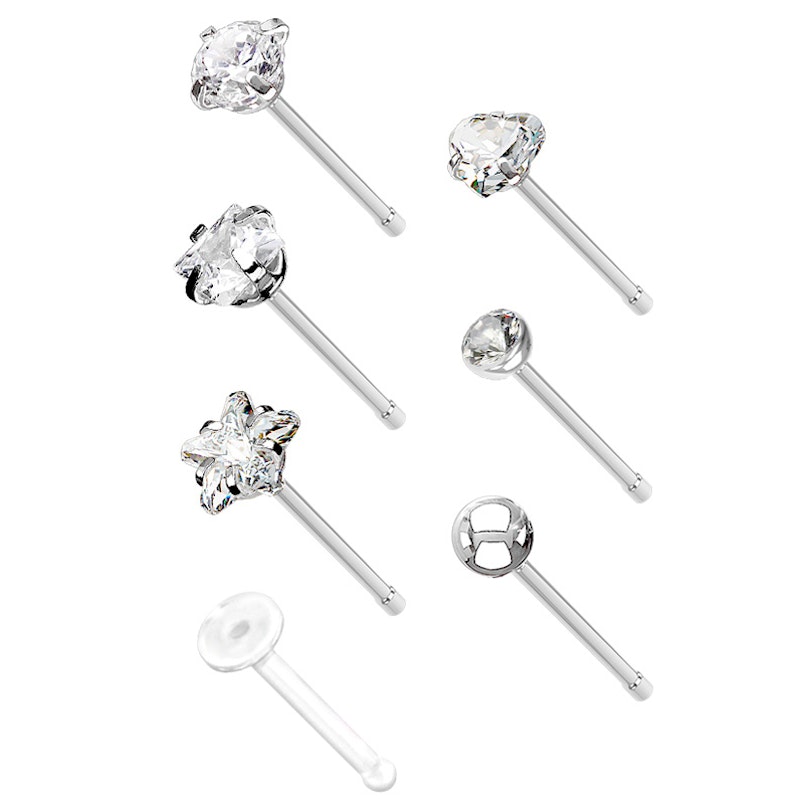 Met dit pakket van neusstaafjes is het helemaal aan jou welke neuspiercing je wilt dragen. Je hoeft natuurlijk niet een bepaalde neuspiercing op een bepaalde dag te dragen, of zelfs een neuspiercing de hele dag door te dragen - een neusretainer tijdens het werk, en een neusstaafje met een hartje of een sterretje in de avond. Alle neusstaafjes zijn gemaakt van chirurgisch staal, op de neusretainer na. De maten zijn ook allemaal hetzelfde bij alle neusstaafjes, namelijk een draaddikte van 0,8 mm en een lengte van 6 mm.