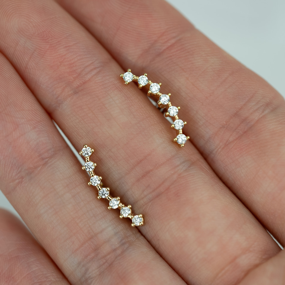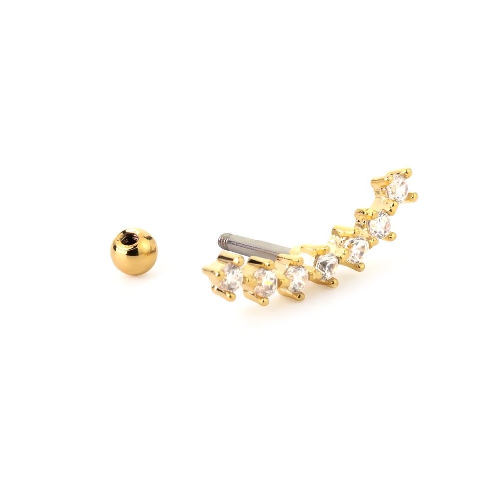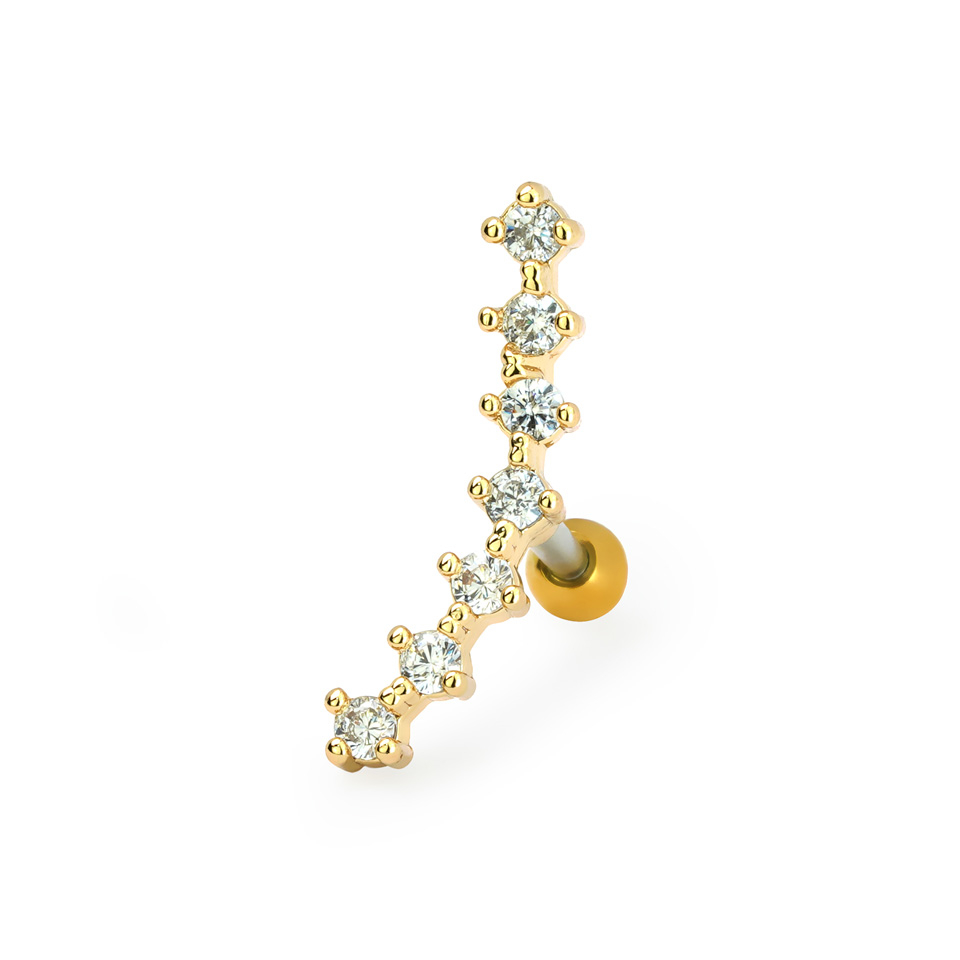 Je oorbellen kunnen elke look afmaken, en als je hier iets opvallends zoekt is dit sieraad perfect voor jou. De gebogen top van dit piercingstaafje fonkelt als een rij sterren aan een nachtelijke hemel. Dit sieraad trekt op zichzelf al genoeg aandacht, maar het is ook een perfecte aanvulling op een combinatie van verschillende sieraden. Je kunt hem bijvoorbeeld dragen in je helix, conch, of oorlel. Wissel het zo vaak af als je zelf wilt en probeer verschillende combinaties.