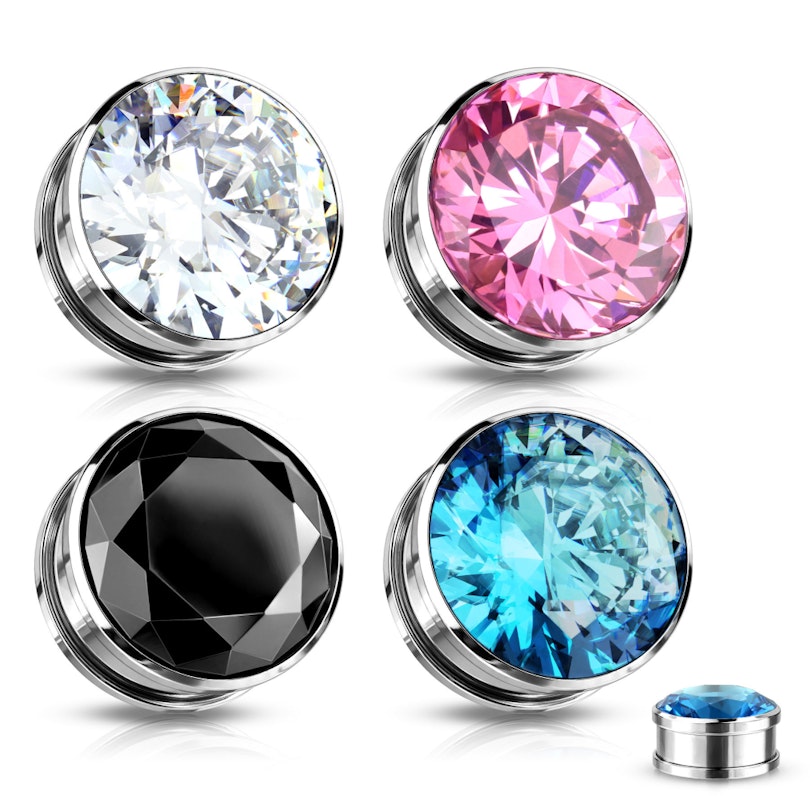 Deze plug is gemaakt van chirurgisch staal en is in vier verschillende kleuren en in vele afmetingen te verkrijgen. Aan de voorkant zit in een mooie, grote diamantvormige steen in echt prachtige en felle kleuren, die zelfs bij de kleinste afmetingen in het oog springt. De rug wordt aan de achterkant gesloten met een schroefdraad en is dus heel gemakkelijk in het oor te schuiven en ook wat gewicht betreft is deze plug aangenaam te dragen.