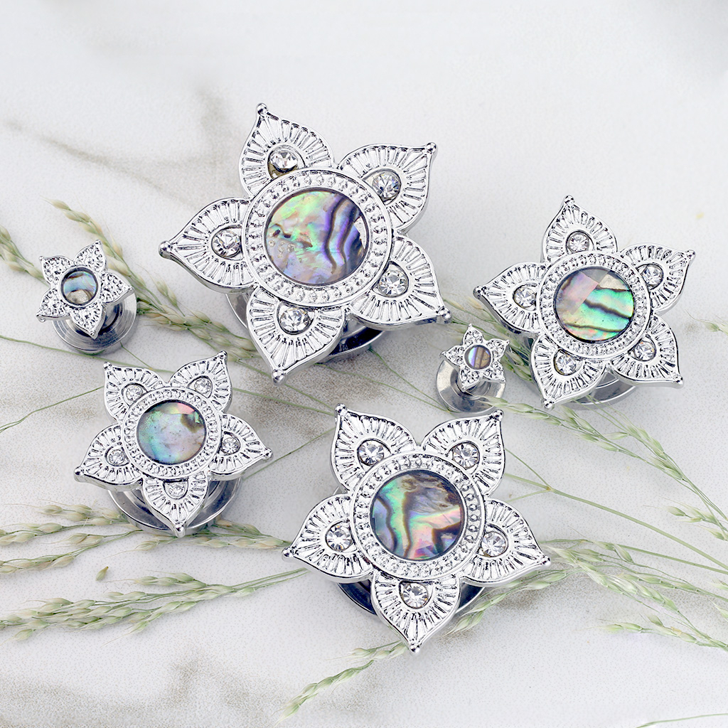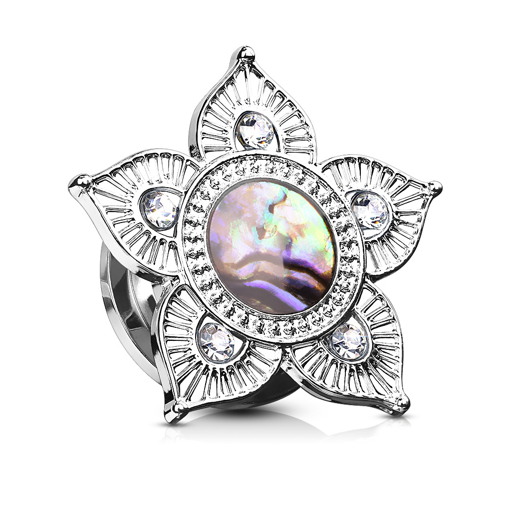 Je hebt al een glimp opgevangen van de mooie plug op de afbeelding hierboven toen je naar beneden scrolde om deze tekst te lezen. Deze plug is uitgerust met een messing voorkant, gevormd als een lotusbloem. Ieder bloemblad heeft een aantal kleine verdiepingen, en er zit op de onderkant van ieder blad een transparante steen - met als uitzondering daarbij de groottes 3 mm, 4 mm, 5 mm en 6 mm. In het midden van de bloem zit de grote zeeoor. Een zeeoor is een soort schelp met een parelmoerachtige kleur aan de binnenkant van de schelp. Daarom worden zeeoren vaak gebruikt voor het creëren van sieraden. Aangezien zeeoor een natuurmateriaal is, is het ook belangrijk om te melden dat geen twee schelpen hetzelfde zijn. Daarom zal de voorkant altijd verschillend zijn bij alle sieraden.