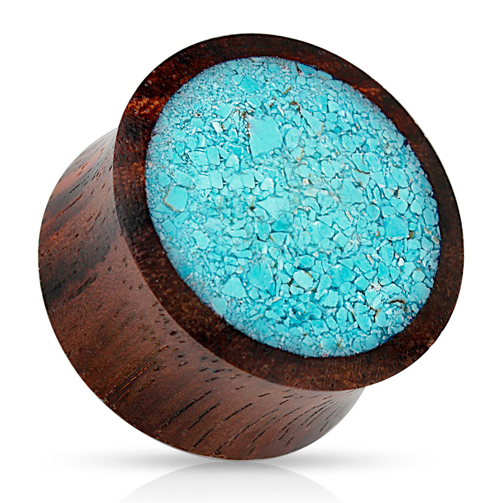 Hier is de plug verder gedecoreerd met een wel heel unieke voorkant die bestaat uit verpletterd turkoois steen. De vele kleine, verpletterde steentjes passen samen als puzzelstukjes in een puzzel. Het oppervlak is verder nog gepolijst, zodat het heel glad is. Het is eigenlijk een klein kunstwerk in zichzelf en een heel nieuwe en creatieve manier van je stretch versieren.