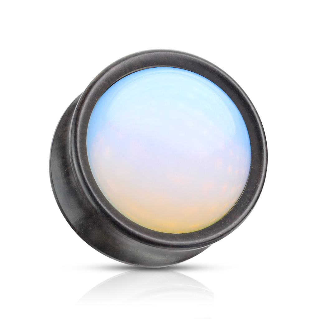 Deze plug is gemaakt van twee organische materialen, namelijk hout en glas. In hoeverre glas een organisch materiaal is, staat ter discussie, aangezien het een zandsmeltingsproces ondergaat. Dat daargelaten, is het sieraad natuurlijk ook een genot voor het oog met zijn warme bruine houtskleur en melkwitte opaliet op de voorkant. Zoals je hierboven kunt zien, is opaliet meerkleurig. Het lijkt een witte basis, maar er zitten nuancen van blauw, roze en oranje in, welke zichtbaar worden al naar gelang de hoek van waaruit het licht erop valt.