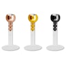 Dit sieraad is te verkrijgen in verschillende lengtes en kleuren. Je kiest zelf welke combinatie je voor je piercing wil. Welk model je ook kiest, de top van het sieraad is altijd versierd met een steen, vastgezet in een 2,5 mm. klein balletje, zodat je enkel de kleur nog zelf moet kiezen.