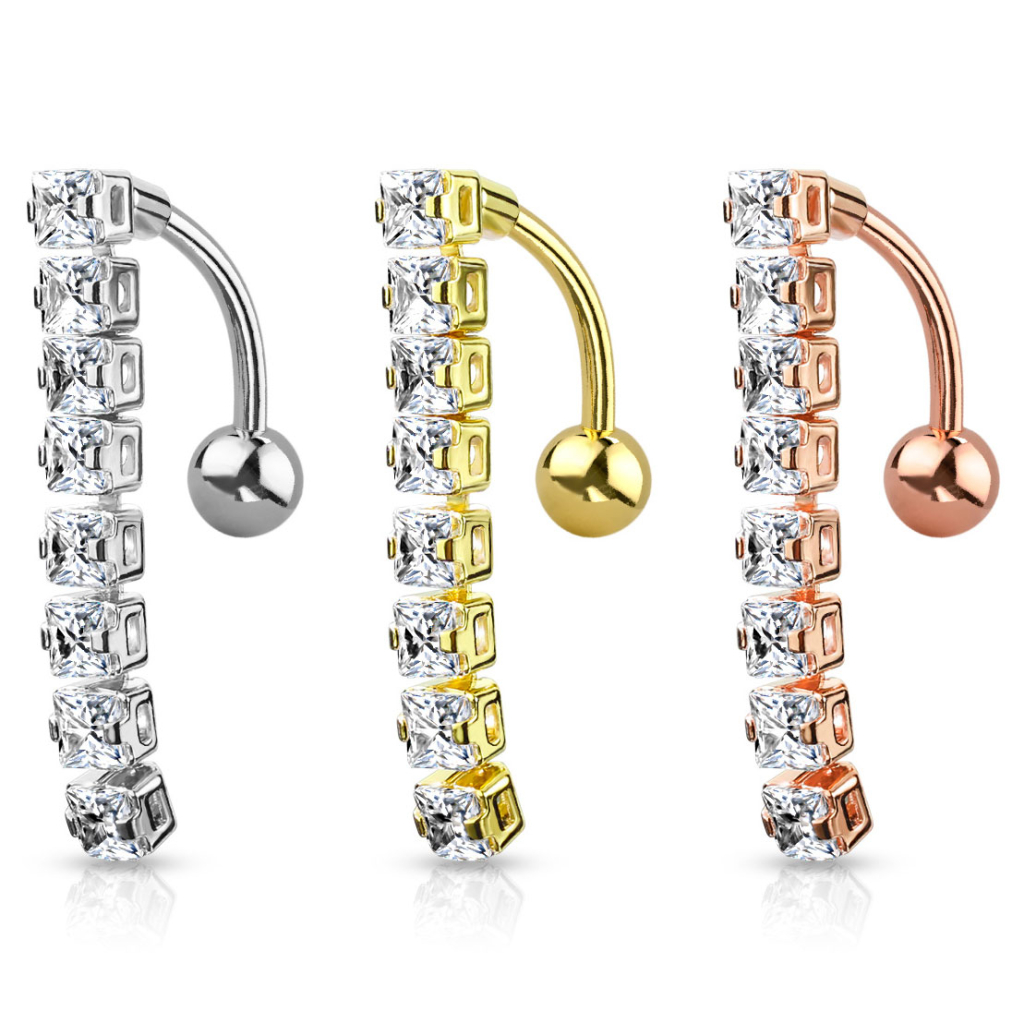 Je kunt dit model kiezen in een van drie geweldige kleuren, glanzend zilver of twee verschillende kleuren goud. Welke kleur je ook kiest, het sieraad blijft verder hetzelfde met een staaf van 10 mm en 8 vierkante stenen die onder elkaar in de hanger hangen.