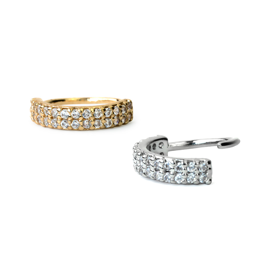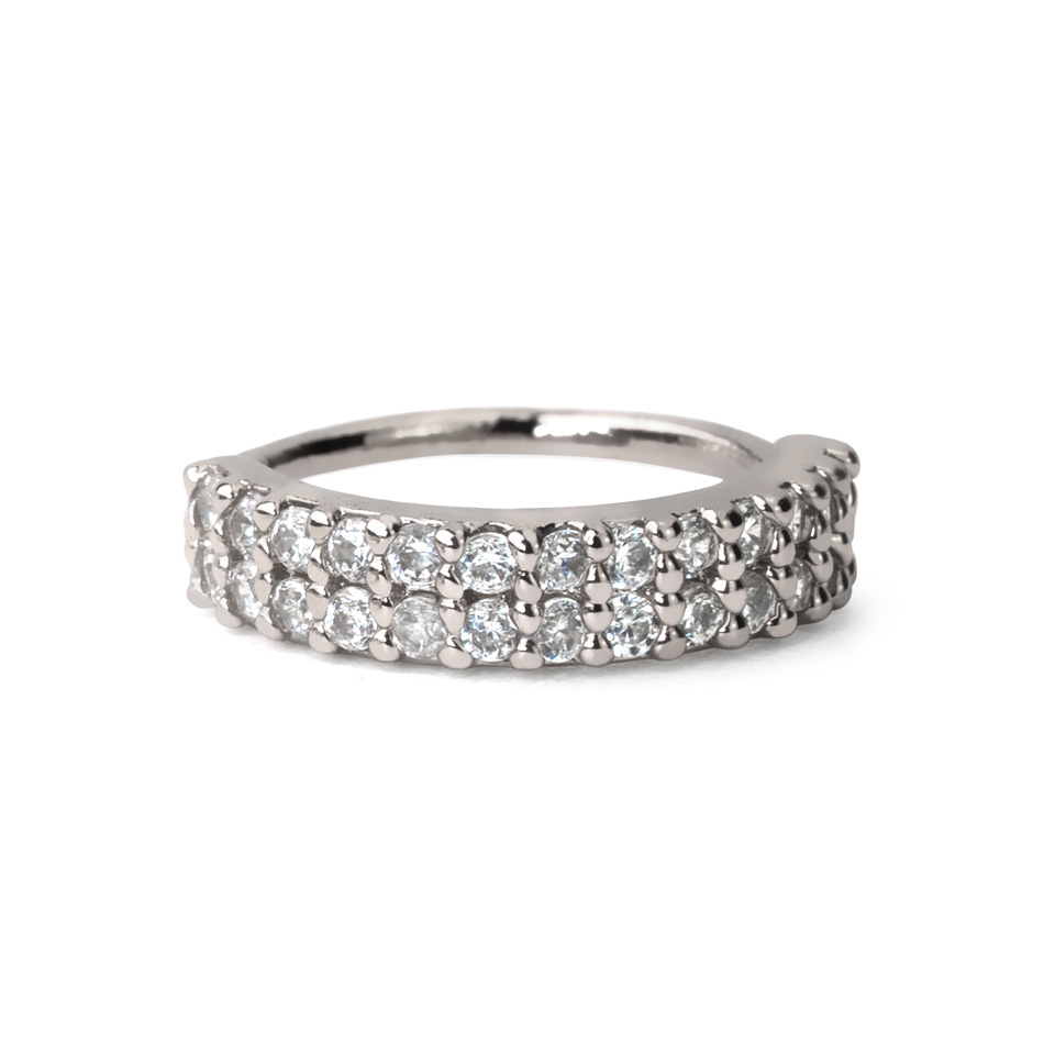 Op de ring vind je niet minder dan 2 rijen met steentjes, welke bijna de helft van de ring bedekken - in totaal fonkelen er 26 kleine transparante steentjes. De andere helft zit in je piercing en is dus niet zichtbaar.