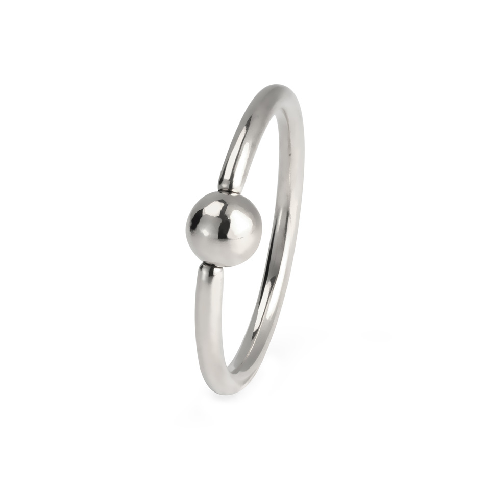 Deze ring ziet eruit als een gewone ball closure ring. Het verschil is dat het balletje aan één van de uiteindes vast zit en dus niet kwijt kan raken.