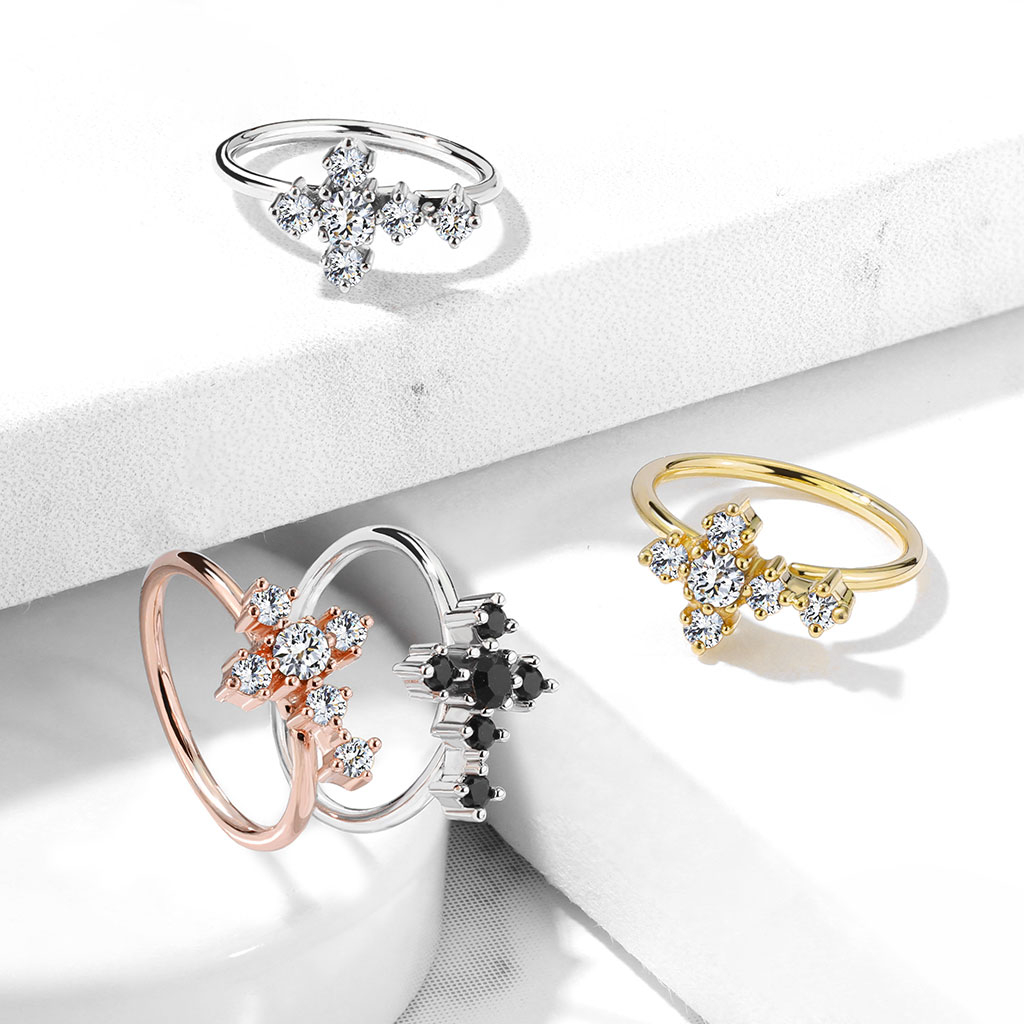 Het juweel bestaat uit messing en is 0.8mm in draaddikte en 8mm in diameter. Als je de blanke versie kiest dan is het sieraad gecoat met een platinumlaagje, de twee gouden versies hebben dan weer een 14 karaats goudlaagje. Zoals je waarschijnlijk wel al hebt opgemerkt, is het sieraad op de voorkant voorzien van een mooi kruis. Dit kruis is met zes kleine stenen bezet, waarvan je de kleur zelf kan kiezen. Zo kun je kiezen voor transparante of zwarte stenen.