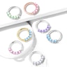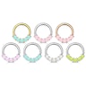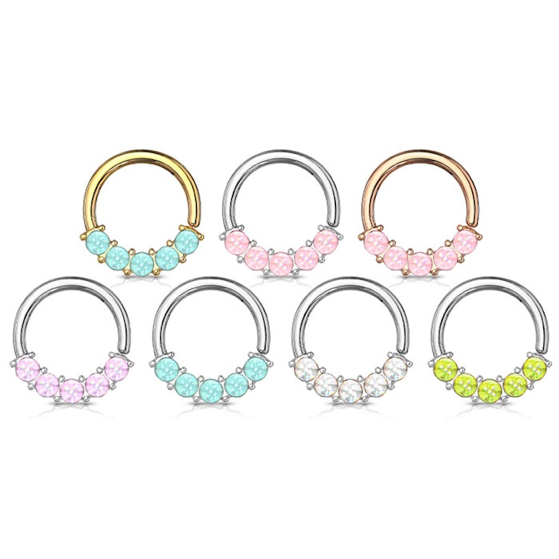 Dit juweel bestaat uit chirurgisch staal en is gecoat mer verschillende kleuren. Je kunt bijvoorbeeld kiezen voor een ring in een vrouwelijke roodgouden kleur, tenzij een andere kleur je natuurlijk meer aanspreekt. Je kunt alle keuzemogelijkheden bekijken in het vak rechts van de afbeelding. Ook voor de vijf steentjes vooraan op de ring kun je kiezen uit verschillende kleuren, vijf om precies te zijn. Deze steentjes zijn uit een soort hars vervaardigd dat reflecteert wanneer er licht op valt. Je krijgt met dit sieraad dus een echte eyecatcher, waar je hem ook draagt.