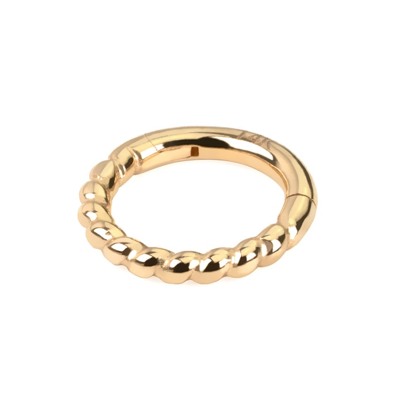 De ring die je op de foto hierboven ziet, ziet er gesloten uit als een ring zonder uiteinden. Maar er bevindt zich eigenlijk een scharnier op de kleine ring dat kan worden geopend en gesloten door zacht te duwen. Op deze manier kun je de ring eenvoudig in je piercing inbrengen en vervolgens met een klikje sluiten. De ring bestaat uit 14 karaats goud. Van goud is bekend dat het een flexibel materiaal is, en dit is niet anders voor dit sieraad. Als het te gemakkelijk opent en sluit, kun je de ring openen en de uiteinden naar elkaar toe duwen zodat de opening kleiner wordt. Op deze manier is het slotje meer als een gesp en is het moeilijker het te openen en te sluiten.