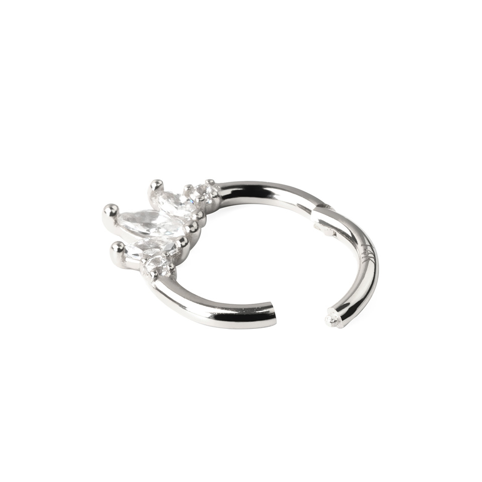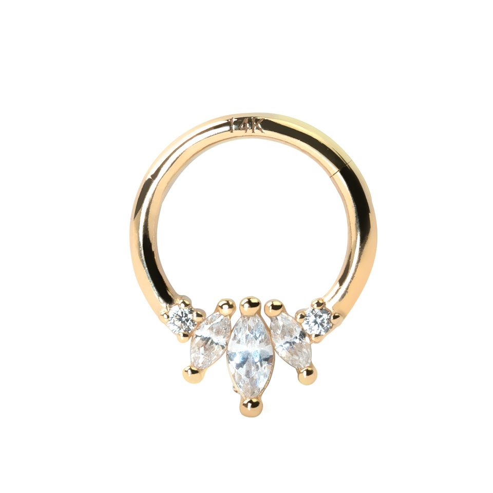 De ring heeft aan de onderkant vijf stenen gemonteerd. Aan iedere zijde zitten twee kleine, ronde steentjes. Dan zitten er nog drie ovale steentjes daar tussenin, met in het midden de grootste. Samen vormen de steentjes een mooie cascade die iedere piercing prachtig zal sieren.
