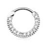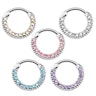 Het septumsieraad is versierd met een lichte parelketting van mooie steentjes over de rand en het model is verkrijgbaar in vijf verschillende steenkleuren. De steentjes gaan door tot de staaf, dus als het sieraad op zijn bestemde plek zit, zul je niets anders zien dan de mooie steentjes die prachtig schitteren als het licht er op valt, en wanneer je beweegt terwijl je het sieraad draagt. Ongeacht welke variant je kiest, alle steentjes zijn mooi omlijst door een rand van balletjes aan de buitenkant. Het ontwerp is zowel elegant als doordacht met aandacht voor de kleinste details.