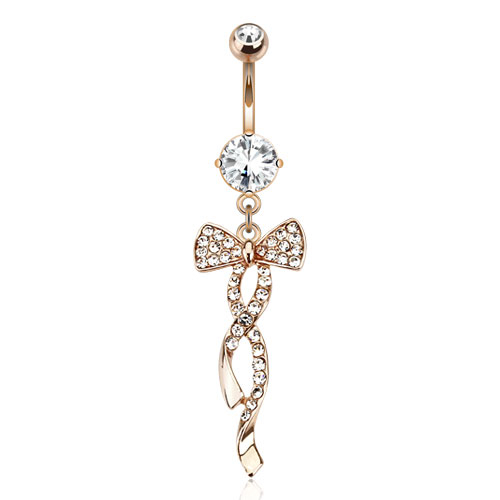 Roodgoud gecoate navelpiercing met een strik en steentjes