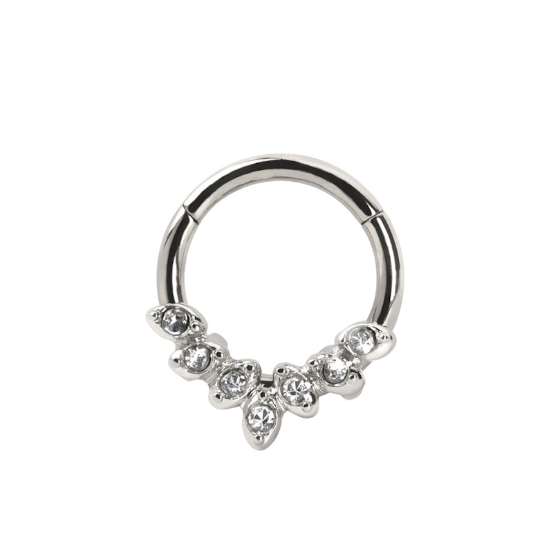 De ring is gecoat met PVD, wat een scala aan kleuropties verschaft. De ring heeft tevens een CZ bladontwerp van 7 prachtige steentjes in verschillende kleuren die perfect passen bij de kleuropties. De schitterende steentjes zijn naar voren gericht, wat de ring perfect maakt voor septum piercings en bepaalde oorpiercings, zoals de daith of de tragus. Natuurlijk kan je helemaal zelf bepalen waar je hem wilt hebben, maar houd rekening met de grootte. De ring breedte/draaddikte is 1.2mm, wat de standaard is voor de meeste gezichtspiercings, en de diameter is 8mm.
