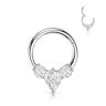 Deze solide chirurgisch stalen ring geeft nou net die schittering die je piercing nodig heeft. Het sieraad heeft een duurzame PVD coating, wat zorgt voor een selectie aan stralende kleuren die langer goed blijven dan bij standaard coating. De ring heeft tevens een flashy steentjes ontwerp dat bestaat uit een grote peervormige middensteen en twee kleinere ronde steentjes. Deze heldere steentjes zijn naar voren gericht, wat de ring perfect maakt voor septum piercings of bepaalde oorpiercings, zoals de daith of tragus.