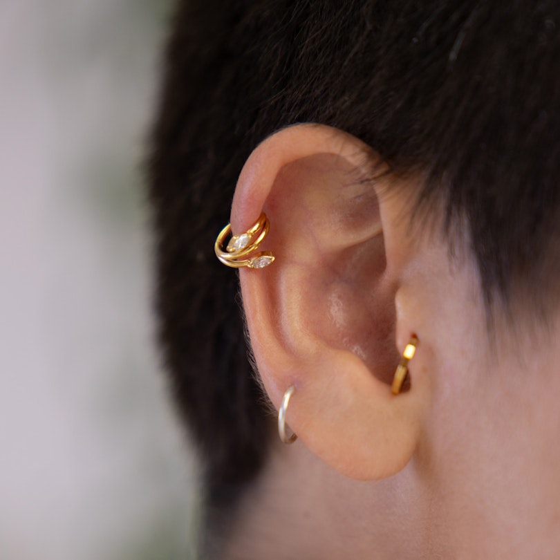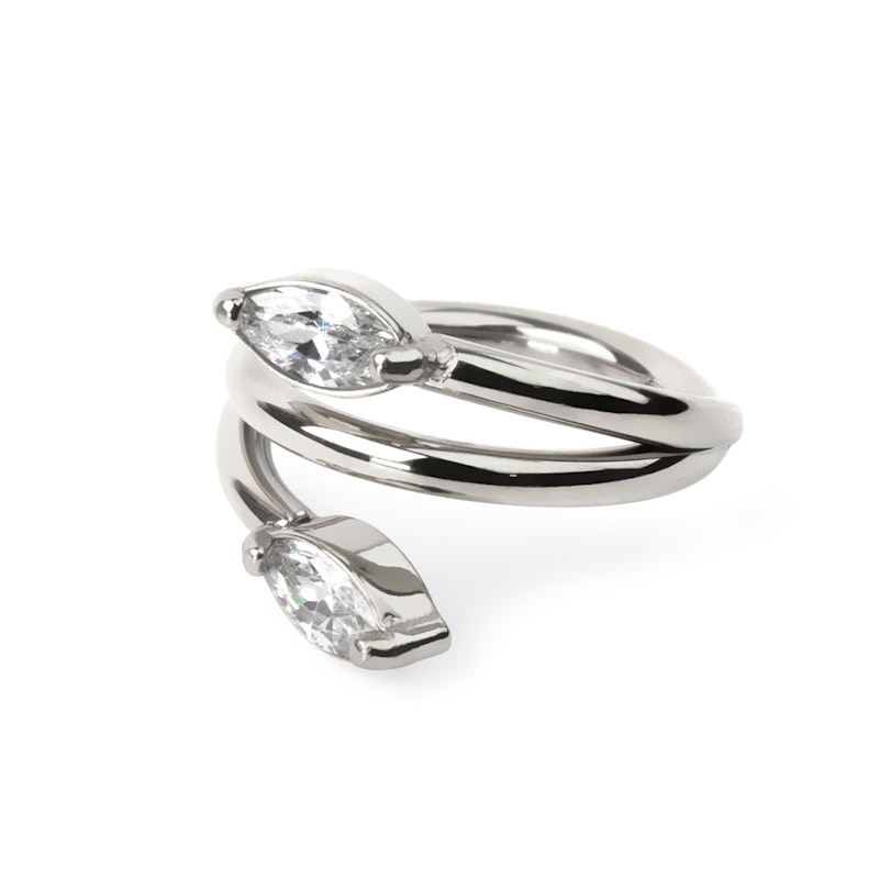 Sierlijke ring van chirurgisch staal met scharnier. Deze prachtige ring heeft twee markies-geslepen steentjes die eruit zien als bladeren aan een wijnrank. Ga voor goud of zilver en kies uit een diameter van 8 mm of 10 mm. Dit veelzijdige ringetje staat prachtig in al je oorpiercings, maar vooral je rook en helix.