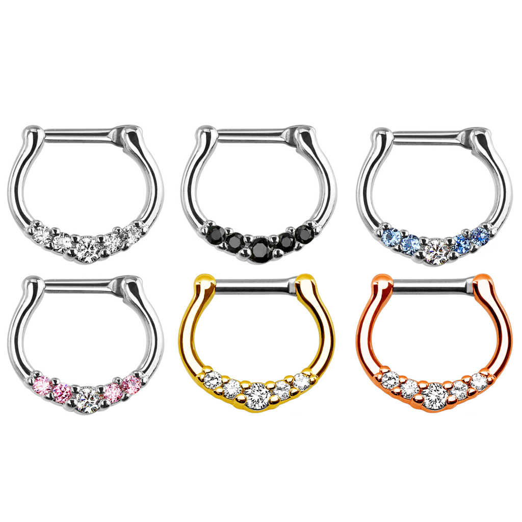 Deze mooie en vrouwelijke septumclicker is gemaakt van zuiver chirurgisch staal, en versierd met vijf charmante steentjes. Het steentje dat in het midden zit is iets groter dan de andere vier, wat de indruk wekt dat de ring druppelvormig is.