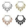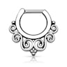 Versier je septum met zachte rondingen, die als een S-vormig model aan de onderzijde van het sieraad kronkelt. Dit weelderige model is volledig symmetrisch en heeft twee mooie, grote bogen die elkaar in het midden ontmoeten en met daarop drie kleine kogeltjes die het afsluiten.