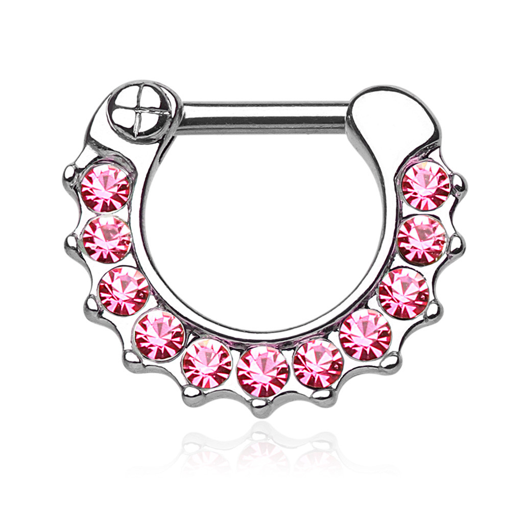 Deze onwijs mooie en eenvoudige septumclicker is klassiek zonder dat het dan meteen ook saai is. Deze septumpiercing is namelijk dicht bezet met mooie, vonkelende steentjes langs de gebogen 3 mm rand. Er zijn in totaal 11 steentjes op dit kleine sieraad, en allen zijn ze facet geslepen met een vorm als diamanten. Deze vorm van slijpen zorgt ervoor dat de steentjes het licht vanuit alle hoeken opvangen en reflecteren, waardoor het extra zal glitteren.