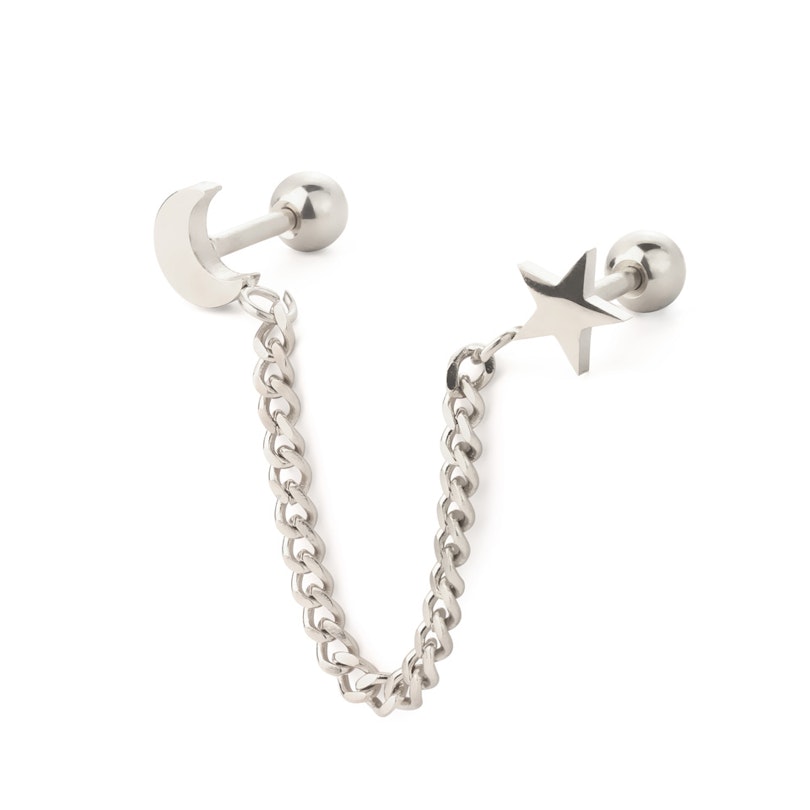 Heb jij twee oorpiercings? Dan kun jij dit sieraad dragen! Het sieraad bestaat uit twee rechte staven met een kettinkje ertussen. De ketting meet ongeveer 4 cm. Niet alle piercings zijn geschikt door de vorm van de staaf. Mocht jij, bijvoorbeeld ƩƩn gaatje in je oorlel hebben en een tweede in de oorschelp, dan kun jij dit sieraad dragen. De staafjes zijn allebei 1.2 mm dik en 6 mm lang. Ze hebben een balletje van 4 mm aan de achterkant en aan de voorkant een ster en een maan.