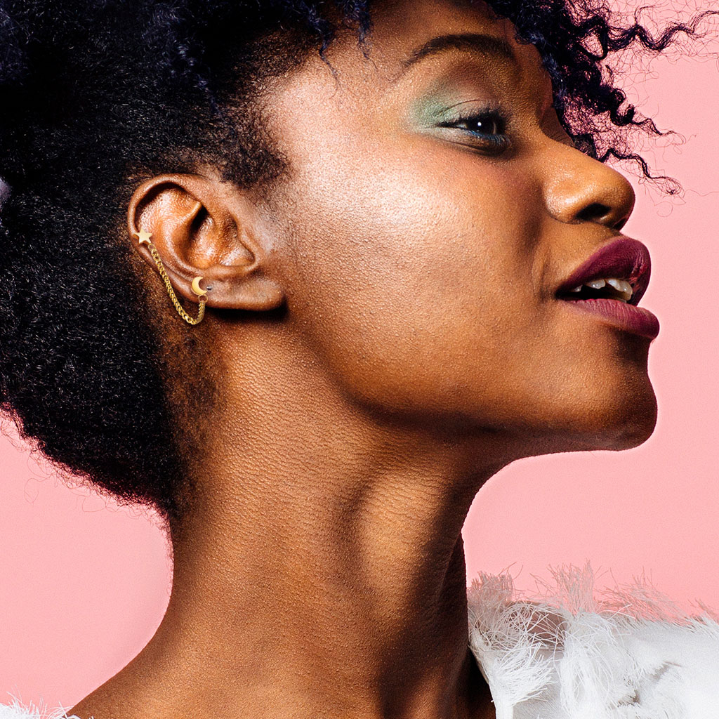 Heb jij twee oorpiercings? Dan kun jij dit sieraad dragen! Het sieraad bestaat uit twee rechte staven met een kettinkje ertussen. De ketting meet ongeveer 4 cm. Niet alle piercings zijn geschikt door de vorm van de staaf. Mocht jij, bijvoorbeeld ƩƩn gaatje in je oorlel hebben en een tweede in de oorschelp, dan kun jij dit sieraad dragen. De staafjes zijn allebei 1.2 mm dik en 6 mm lang. Ze hebben een balletje van 4 mm aan de achterkant en aan de voorkant een ster en een maan.