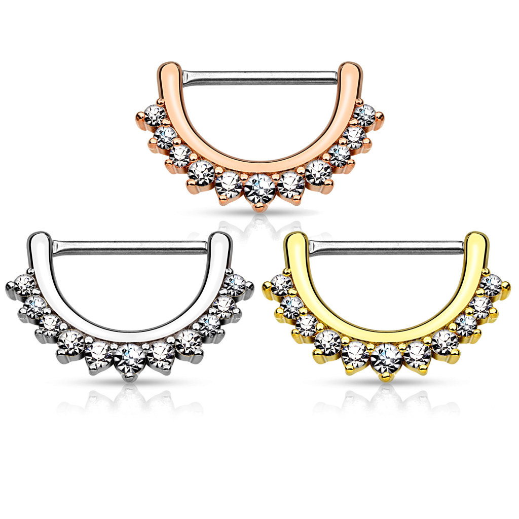 Zoals beschreven, is deze nippleclicker verkrijgbaar in drie verschillende varianten, alleen de kleur is verkrijgbaar. Kies tussen een simplistische glanzende uitgave, een royale gouden uitgave of de meer moderne roodgouden uitgave. Ongeacht je kleurenkeuze, je zult sowieso niet uitgekeken raken op dit sieraad met zijn 11 transparante steentjes die een mooie, transparante halve maan onder je tepel vormen.