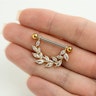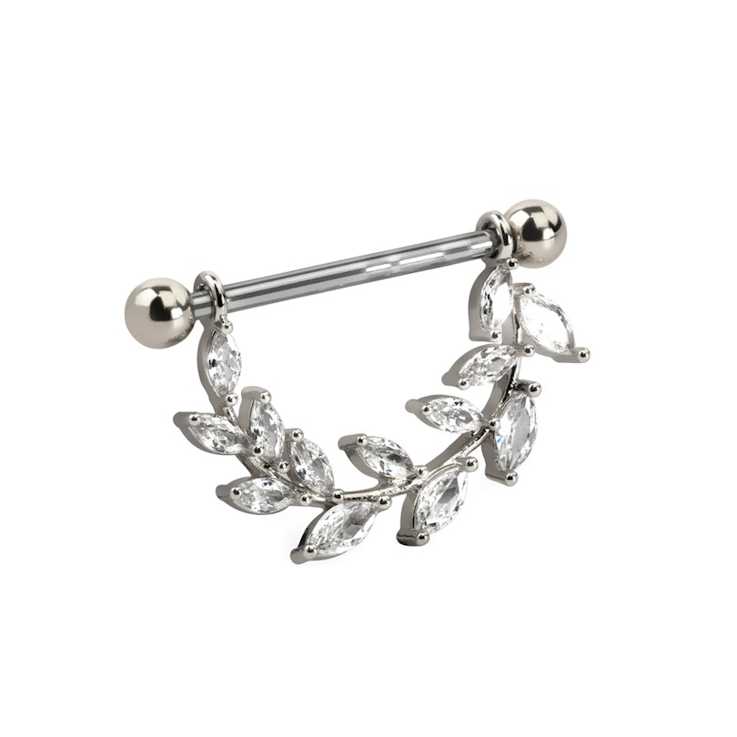Deze tepelpiercing is echt iets voor jou als je een liefhebber bent van de wat meer vrouwelijke designs. Het sieraad bestaat uit een rechte staaf, die men normaal als een piercingstaaf kent - met een balletje aan ieder uiteinde van de staaf. De balletjes kunnen er afgeschroefd worden (en ook gewisseld worden als je daar behoefte aan hebt). Aan de staaf hangt een hanger, die in al zijn eenvoudig uit kleine marquise geslepen steentjes in de vorm van kleine blaadjes bestaat. De steentjes hangen als blaadjes aan een takje, bevestigd aan de uiteinden van de blaadjes.