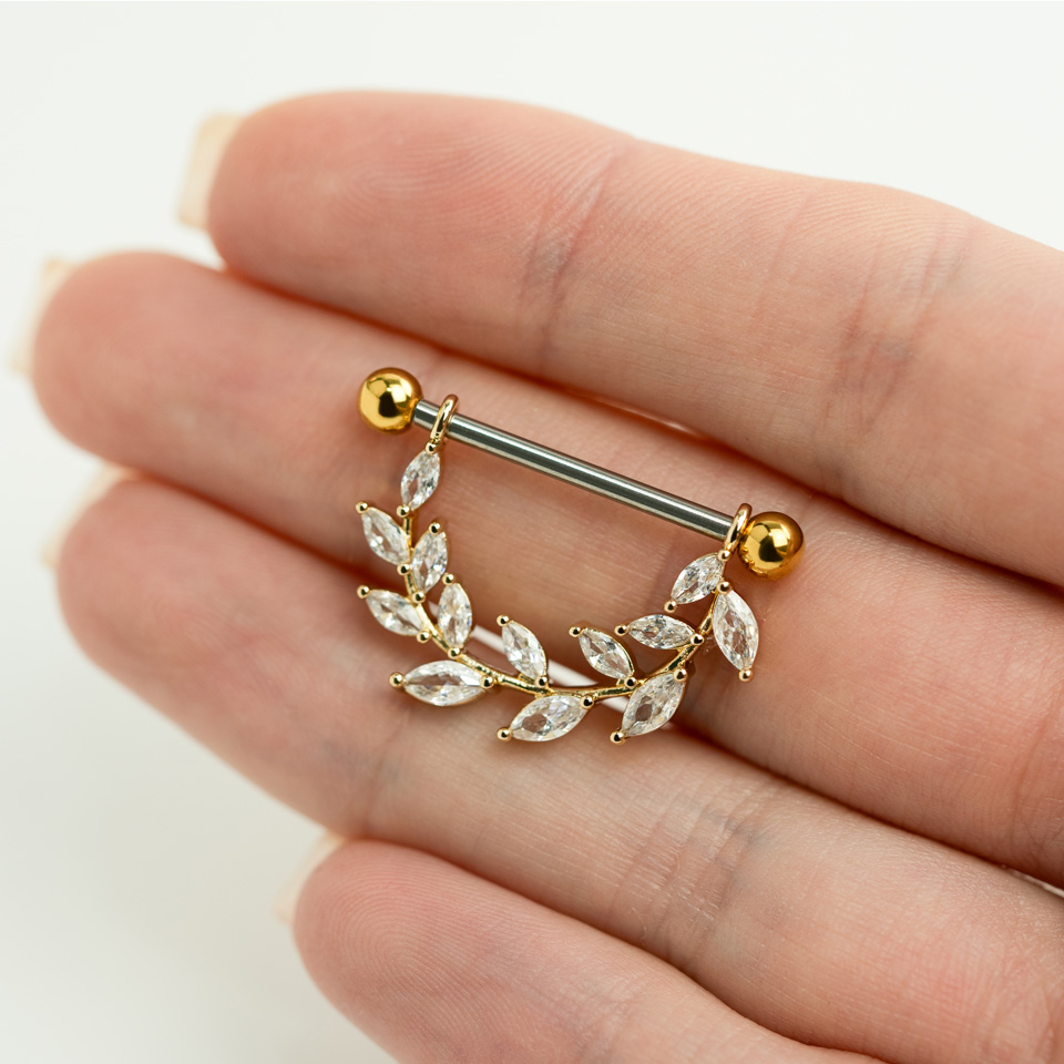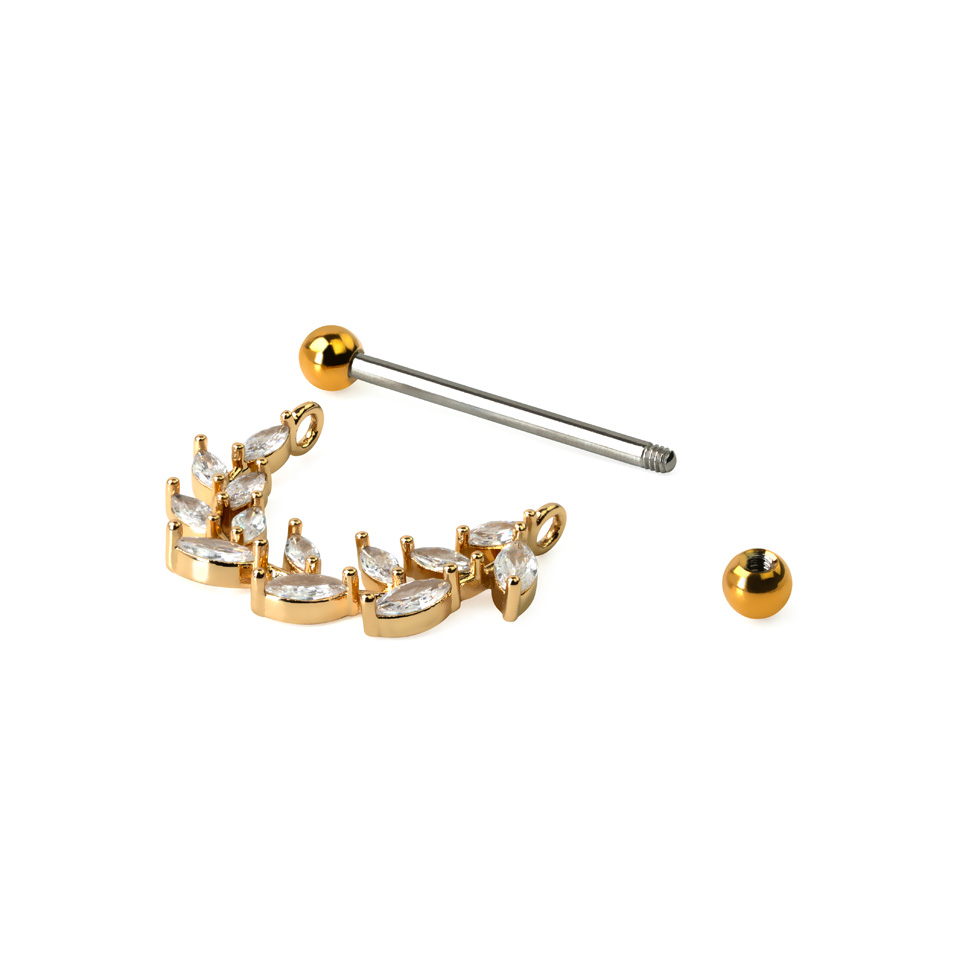 Deze tepelpiercing is echt iets voor jou als je een liefhebber bent van de wat meer vrouwelijke designs. Het sieraad bestaat uit een rechte staaf, die men normaal als een piercingstaaf kent - met een balletje aan ieder uiteinde van de staaf. De balletjes kunnen er afgeschroefd worden (en ook gewisseld worden als je daar behoefte aan hebt). Aan de staaf hangt een hanger, die in al zijn eenvoudig uit kleine marquise geslepen steentjes in de vorm van kleine blaadjes bestaat. De steentjes hangen als blaadjes aan een takje, bevestigd aan de uiteinden van de blaadjes.