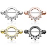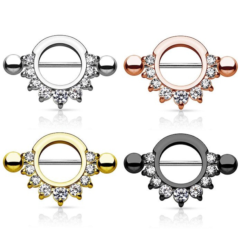 Is het weer tijd om je tepelpiercing te verwennen met een prachtig nieuw sieraad? Dan is dit mooie tepelschild hier misschien wel precies waar je naar op zoek bent. Deze tepelpiercing bestaat uit een staaf die door een gesloten ring gaat, en waarvan het onderste deel de vorm heeft van een mooie met steentjes bezette halve maan. Er zitten in totaal negen mooie druppelvormige steentjes op de ring, en samen vormen ze een prachtige halve maan.