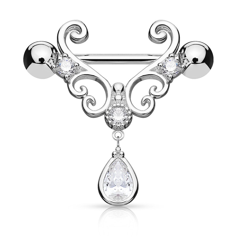 Als het sieraad eenmaal de juiste draagster gevonden heeft en het op de juiste plek zit, kan het bijna niet mooier met de mooie krullen en het hartjesachtigemotief dat de tepel omlijst. Het hartje is doorbroken aan de bovenkant, waar de uiteinden elkaar zouden moeten ontmoeten. Als je naar beneden gaat bij het hartje, stuit je op de twee kleine, transparante steentjes die aan iedere zijde zitten. Aan de onderkant van het grote hartje is ook een steen geplaatst, waaraan er dan nog een hangertje met een druppelvormige steen hangt. Zo lijkt het net alsof er een druppeltje van het hartje druipt.