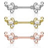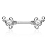 Het sieraad dat je op de afbeelding hierboven ziet, is berekend om gebruikt te worden in een tepelpiercing. Het vrije deel van de staaf is 12 mm, waarbij er aan ieder uiteinde een aantal prachtig uitgevoerde krullen te zien zijn, met daar tussen kleine steentjes. Het design ziet eruit alsof het uit de staaf zelf ontsprongen is, waarbij het zich in verschillende delen heeft opgedeeld, om vervolgens op een prachtige manier krullend samen te komen aan de uiteinden.