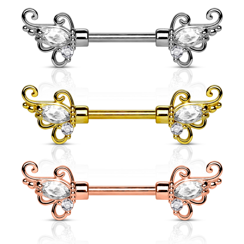Het sieraad dat je op de afbeelding hierboven ziet, is berekend om gebruikt te worden in een tepelpiercing. Het vrije deel van de staaf is 12 mm, waarbij er aan ieder uiteinde een aantal prachtig uitgevoerde krullen te zien zijn, met daar tussen kleine steentjes. Het design ziet eruit alsof het uit de staaf zelf ontsprongen is, waarbij het zich in verschillende delen heeft opgedeeld, om vervolgens op een prachtige manier krullend samen te komen aan de uiteinden.
