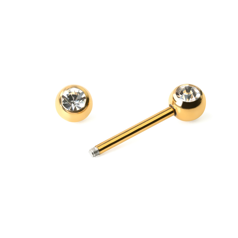Het sieraad is uitgerust met een groot sluitballetje van 6 mm aan elk uiteinde. Deze balletjes zijn niet bepaald bedoeld om discreet te werken, nee, deze mooie ballejtes zijn gemaakt om de aandacht te trekken. De balletjes hebben dezelfde kleur als het staafje, en de balletjes zijn tevens ook versierd met een mooie transparante steen. De steentjes zijn rond als een cirkel en hebben de vorm van een diamant, dus ze glitteren prachtig wanneer het licht er op valt.