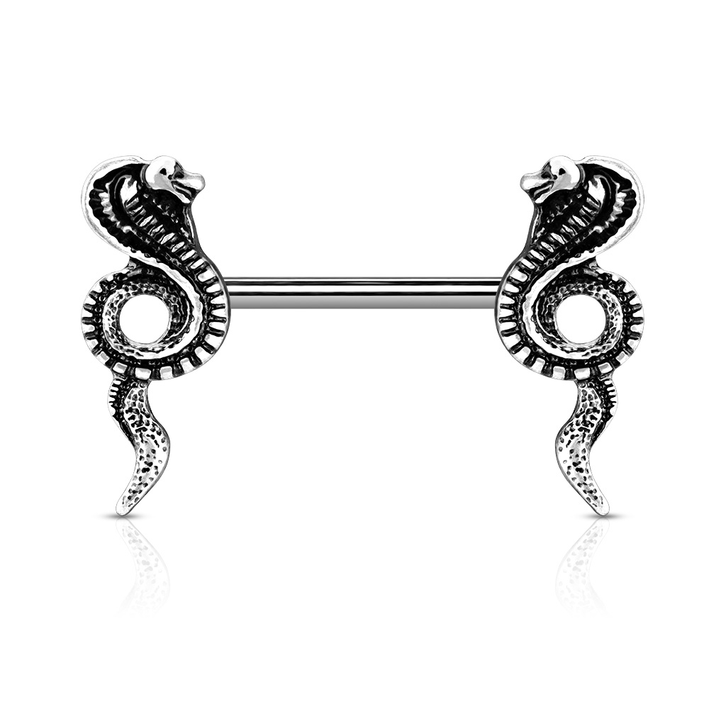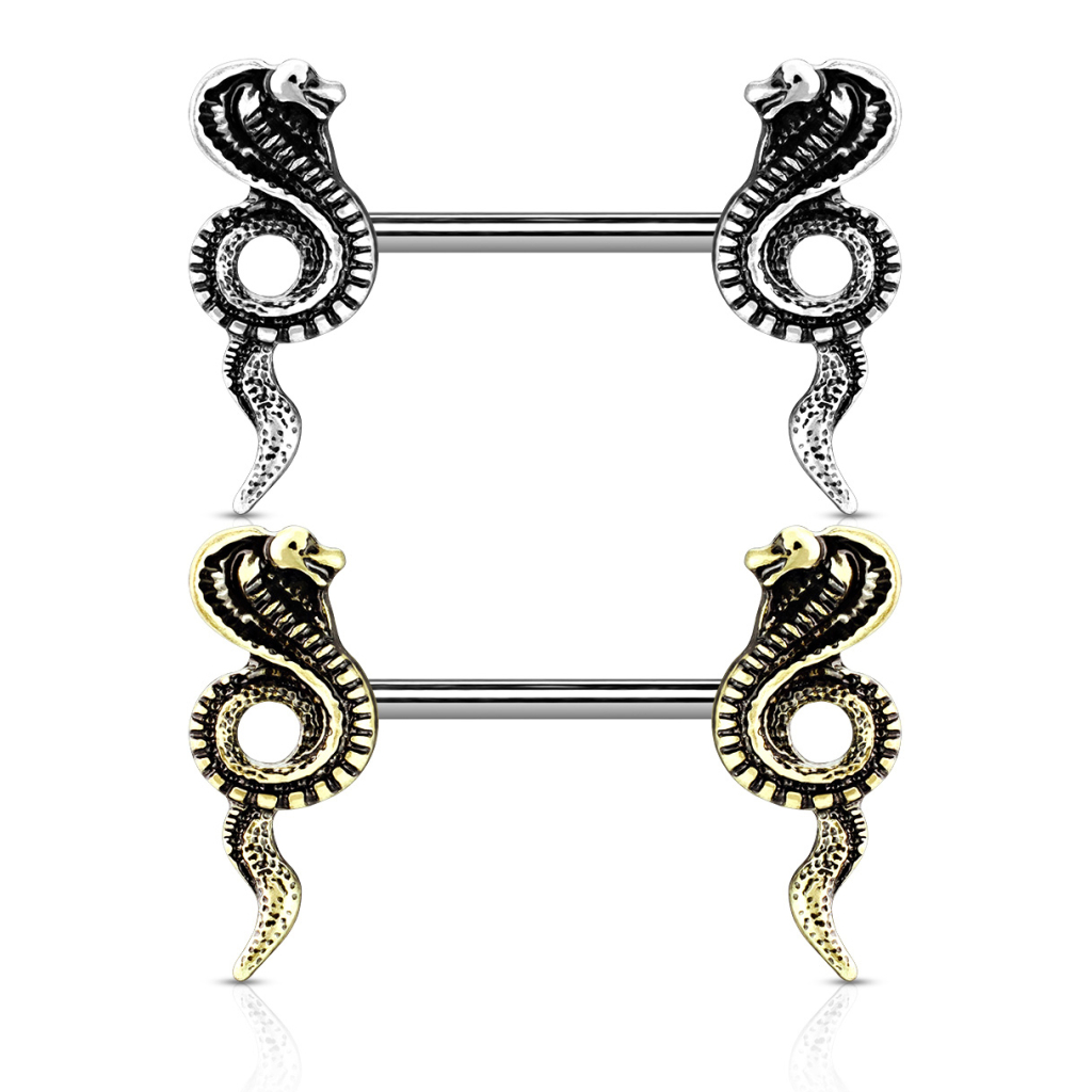 Je kunt dit sieraad in twee kleurenvarianten kiezen. De kleuren vind je terug op de slangen, terwijl het staafje gemaakt is van blank glanzend chirurgisch staal. De slangen zijn gemaakt van messing en zijn vervolgens gecoat met een van de twee kleuren.